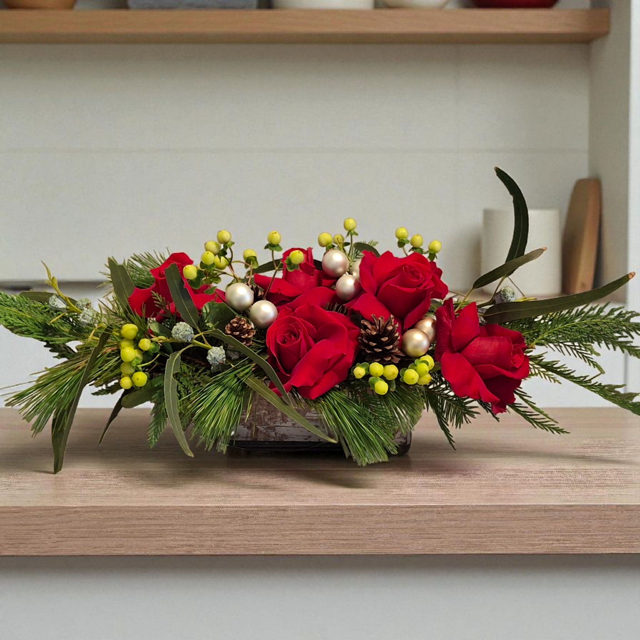 A Stunning Christmas centerpiece with red roses, green coffee beans, stem balls, Christmas greens in a rectangular glass vase would look incredible on any holiday table.