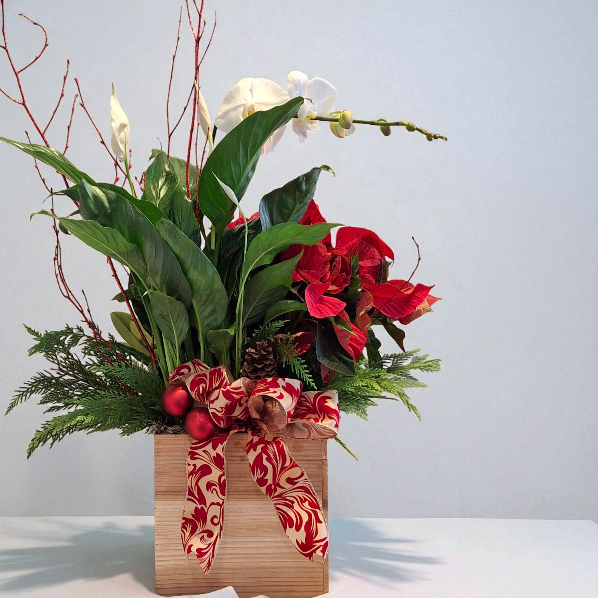 Our simple holiday plant is perfect for somone looking for a long term arrangment featuring poinsettia plant, white phalenopsis orchid, white spathophillum, red branches, pinecones, Christmas balls and cedar.