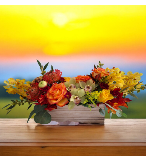 This fall Harvest Centerpiece includes roses, orchids, pin cushion protea and China mums to delight your table full of family and friends.