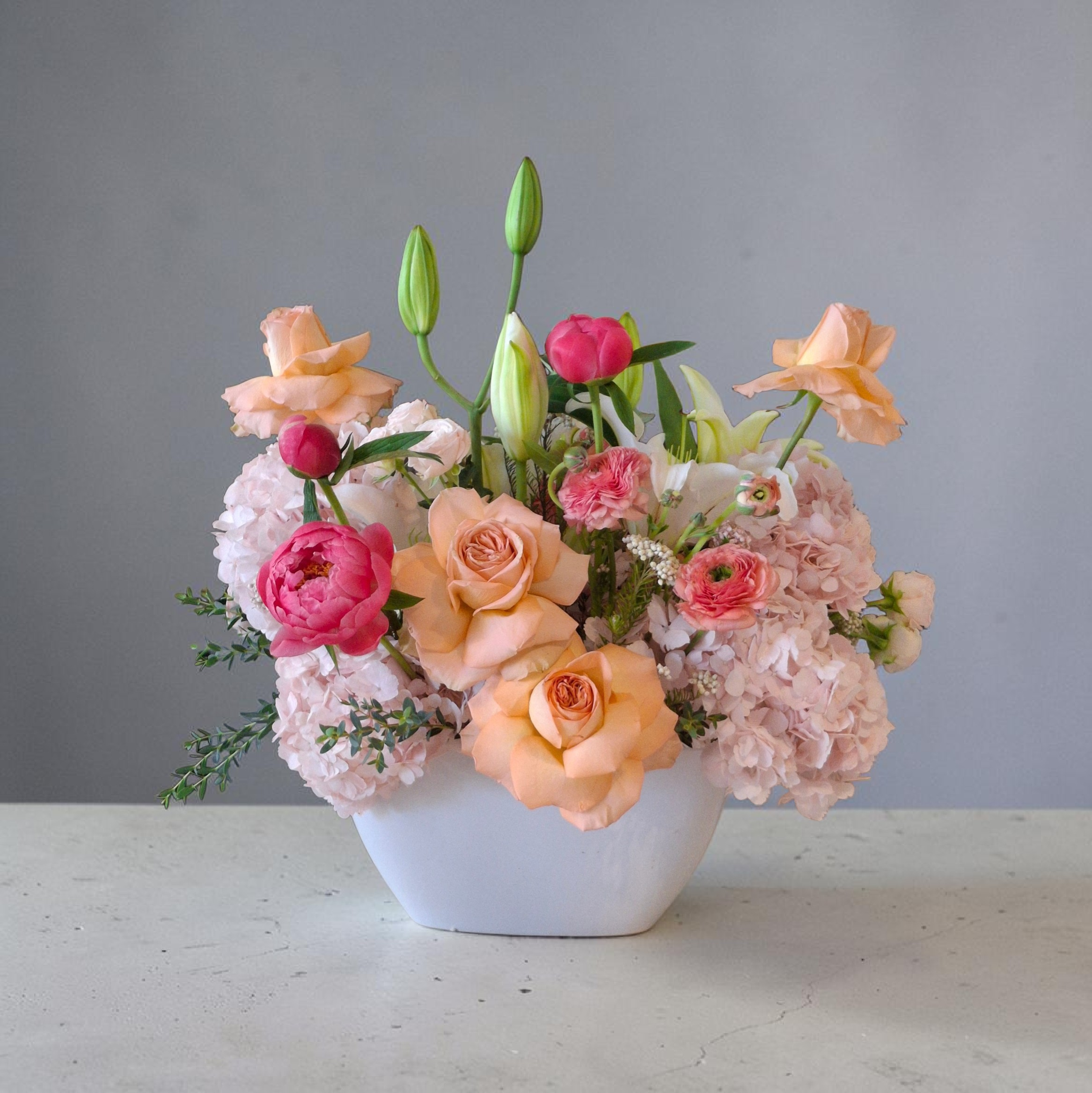 This is for the Mom who sacrifices it all, an arrangement with Roses, Hydrangea, Lilies, Ranunculus and peonies in a solid base.