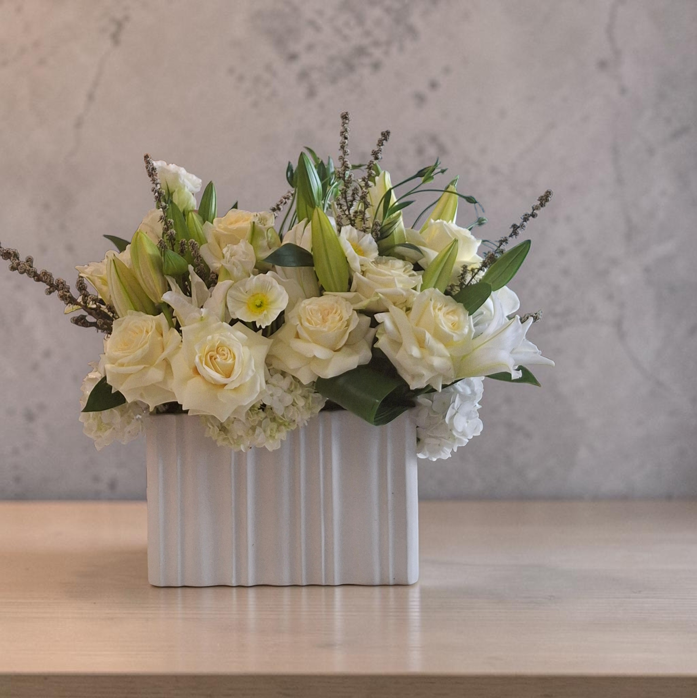 Show Mom that special LOVE with this arrangement with Rose Lilies, white Hydrangeas in a rectangular tall ceramic vase.